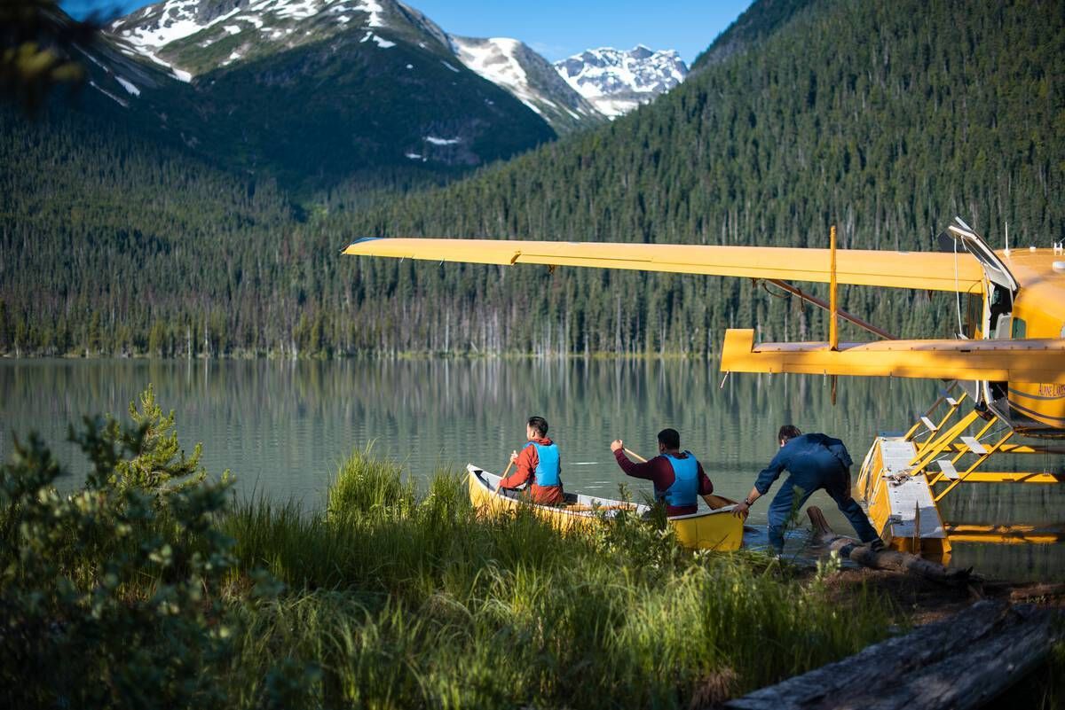 <p>Canoeists set out on a peaceful lake at Burnie-Shea Park, framed by snow-capped peaks, forested hills, and a bright yellow seaplane resting beside the calm, scenic shoreline. Courtesy of Destination BC</p>