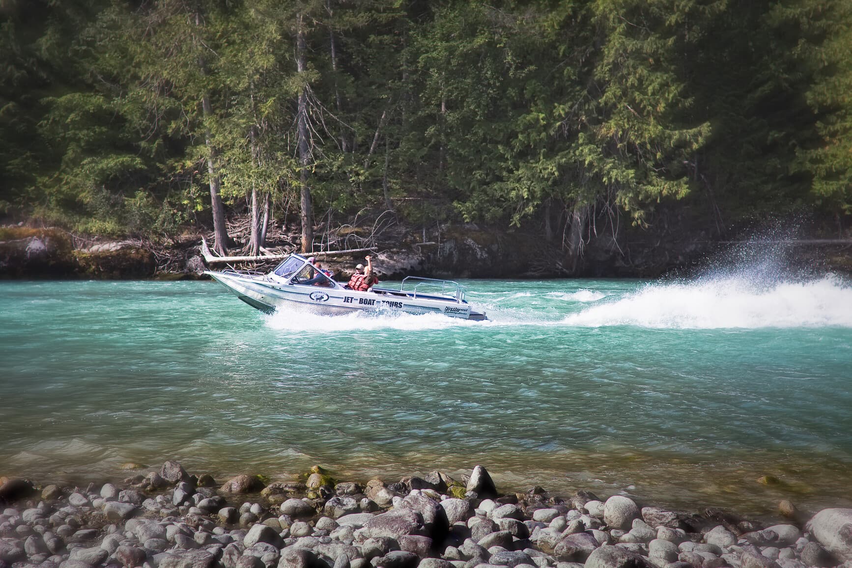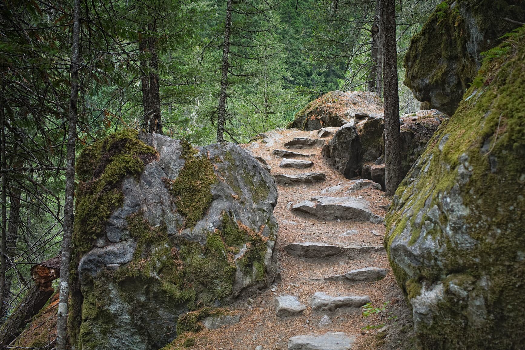 Inukshuk on rocky bank of Green River. Forest can be seen along banks of river.1 / 5Nairn Falls Park