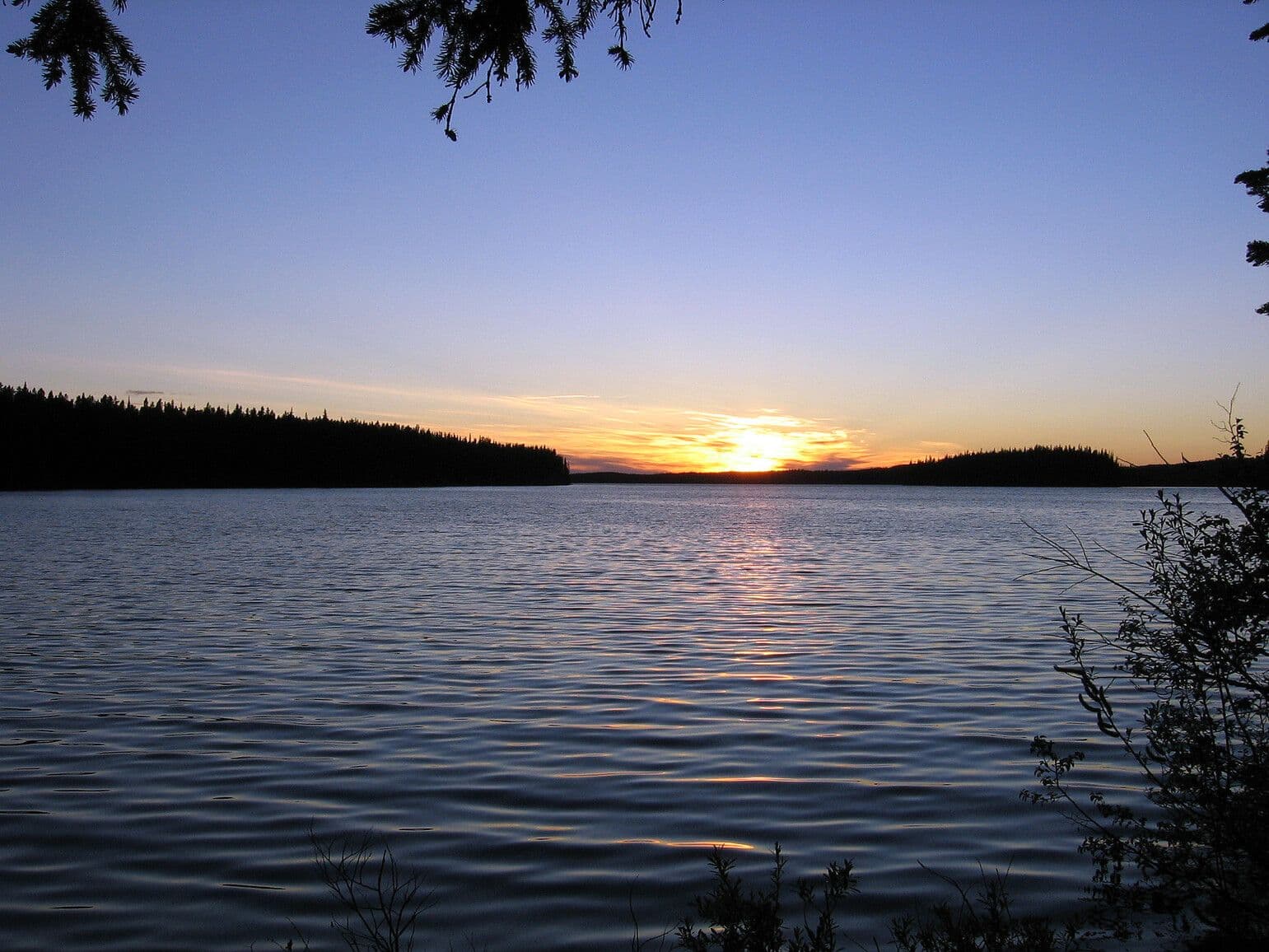 Lily pads floating peacefully on the calm surface of Pennask Lake, with a dense forest lining the far shore in Pennask Lake Park.1 / 2Pennask Lake Park