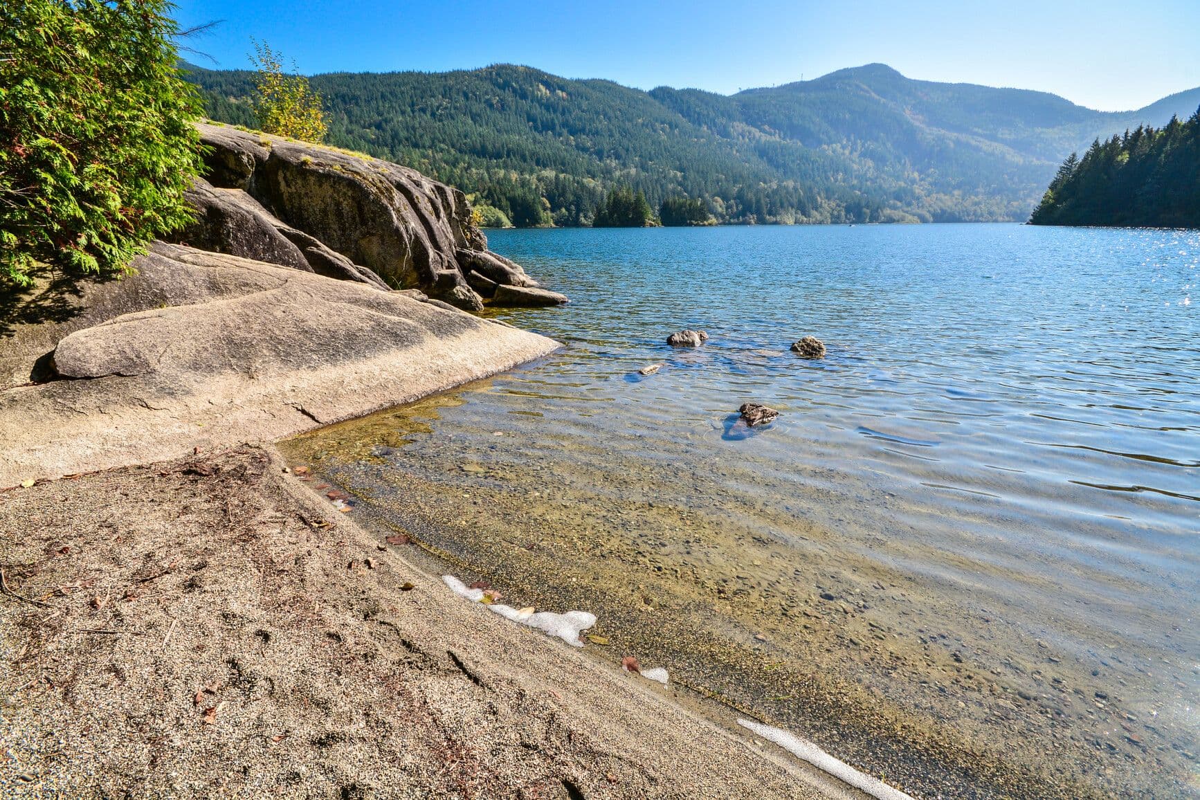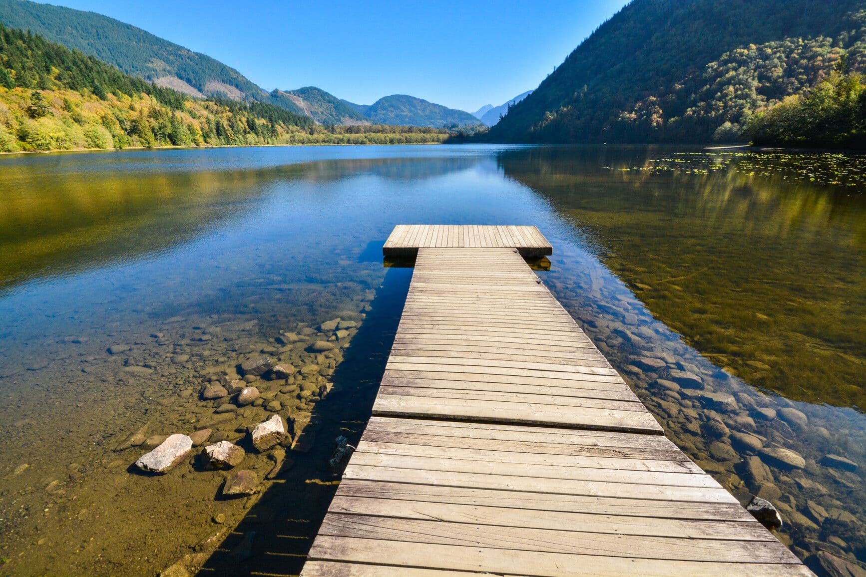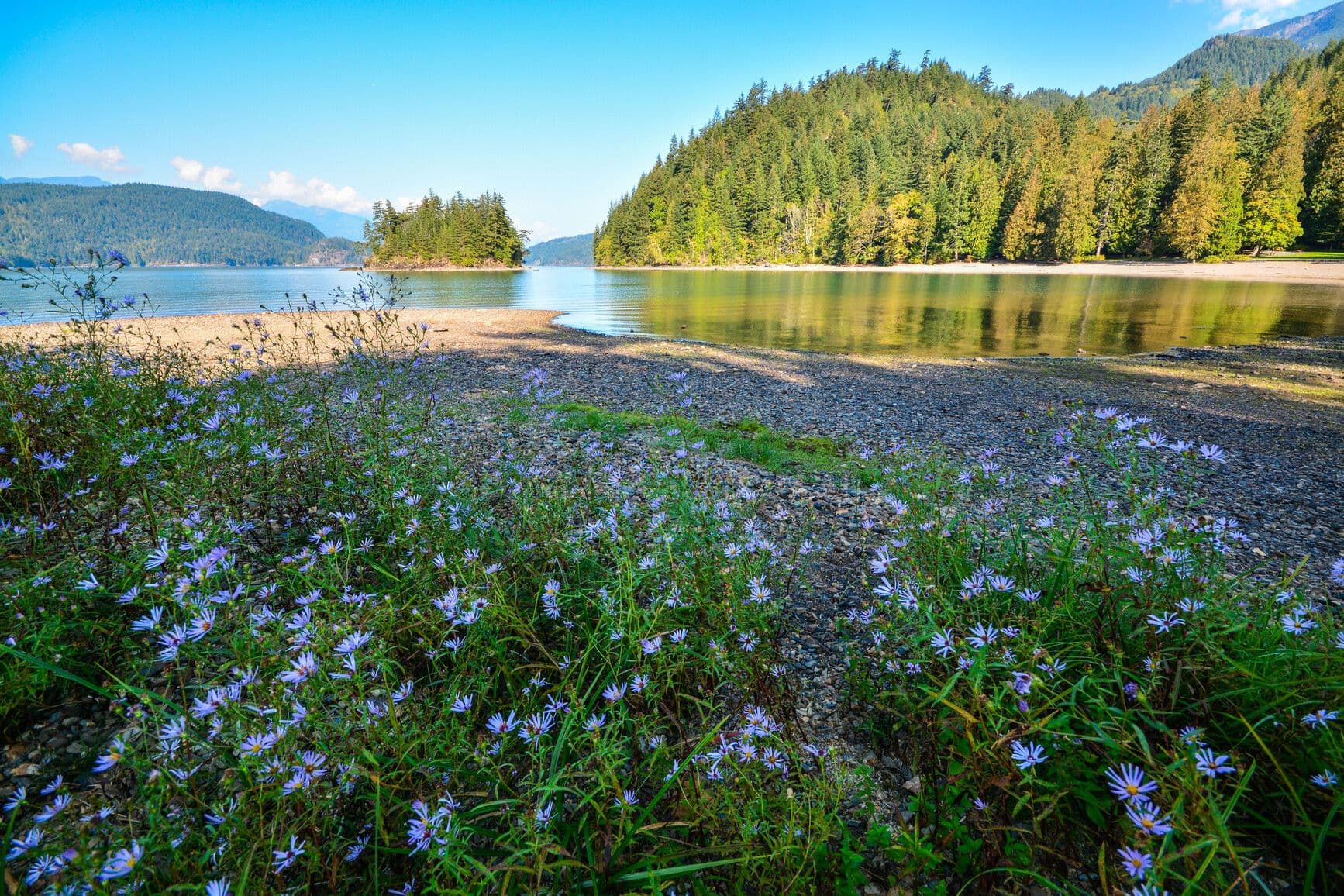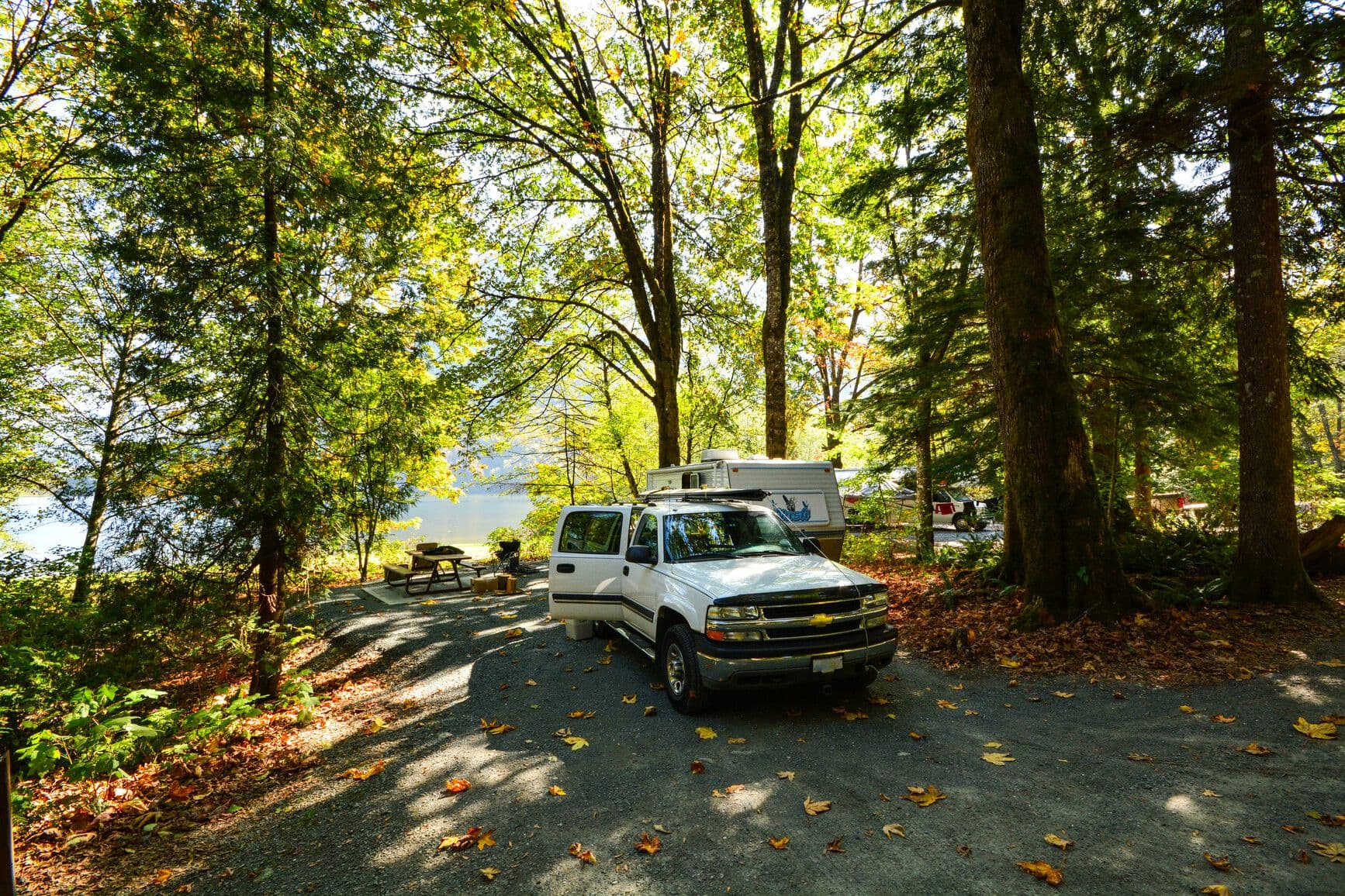Autumn leaves rest in a stream below cascading falls in the dense forest. Sasquatch Park.1 / 10Sasquatch Park