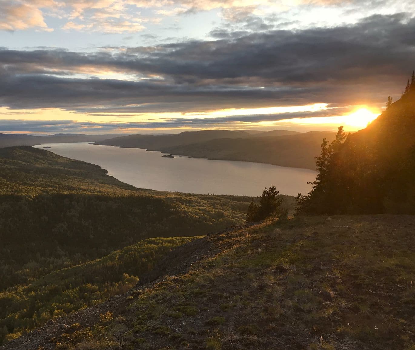 Tilted basalt columns form cliffs above Babine Lake, revealing the region’s volcanic history in Sutherland River Park.1 / 2Sutherland River Park