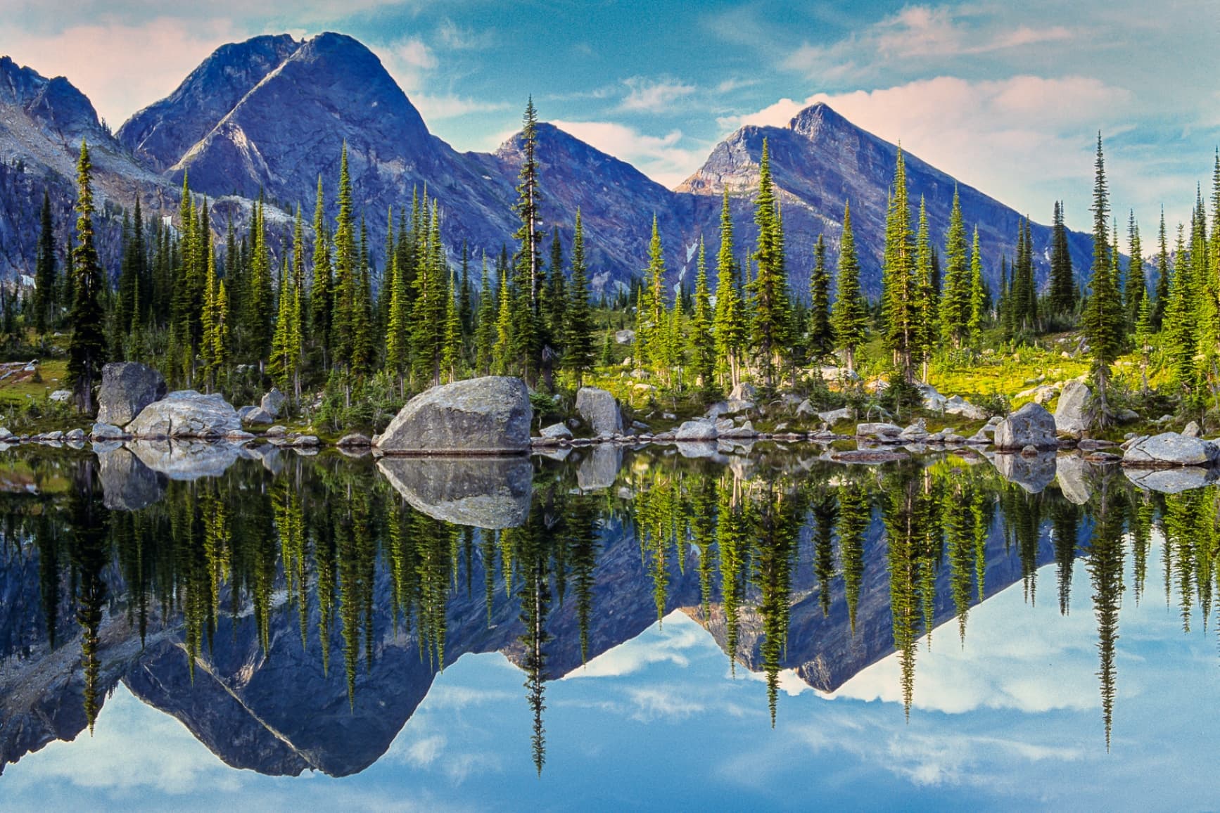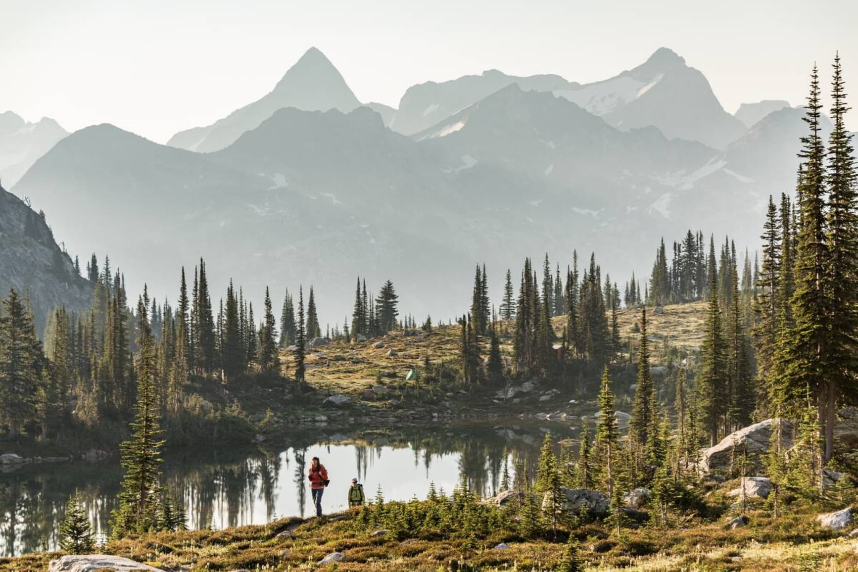 Scenic view of the mountains, forest, and creek. Park visitors are seen carefully over the stream. Photo credit: Destination BC1 / 3Valhalla Park